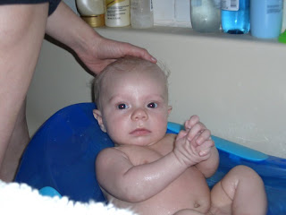 When he was 3 months old, he started getting some baby chub, how cute. You can see the curly hair a little better here. Also he is starting to have some control over his arms and hands now so thus begins the age of sucking on his hands.